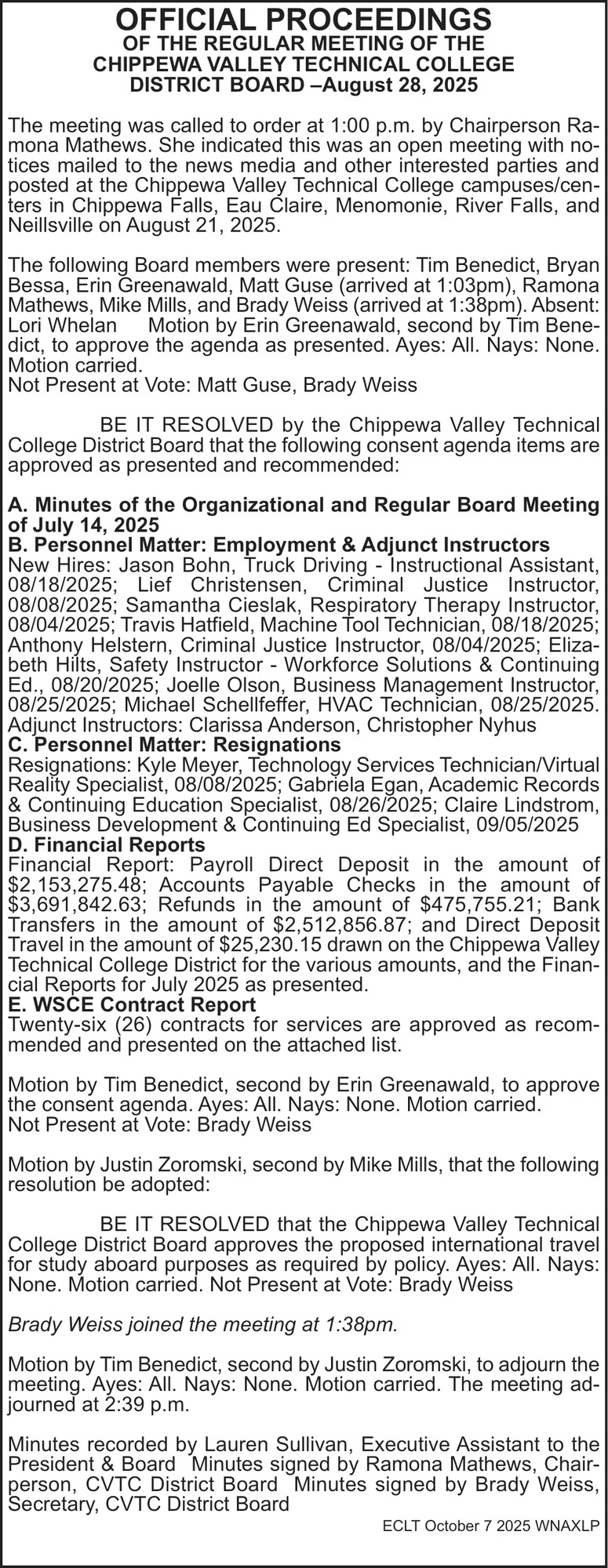 Oct 07, 2025. Chippewa Valley Technical College Notice Ads from Leader-Telegram