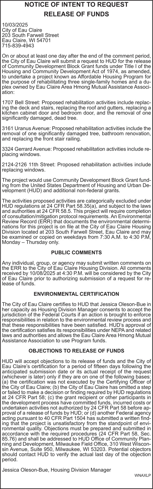 Oct 08, 2025. City of Eau Claire Notice Ads from Leader-Telegram