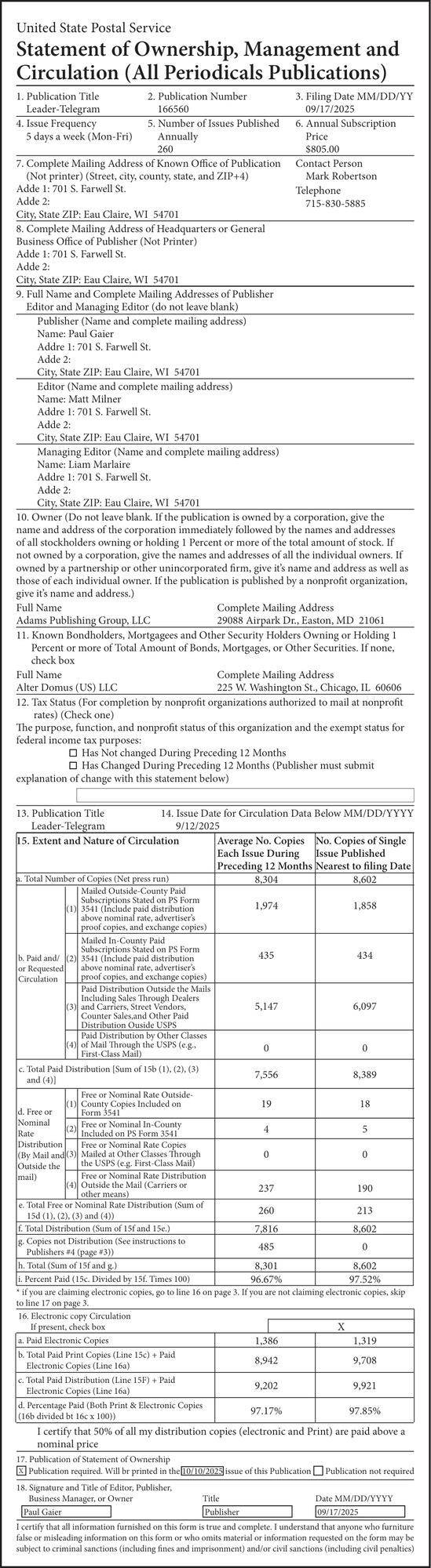 Oct 10, 2025. United States Postal Service Notice Ads from Leader-Telegram