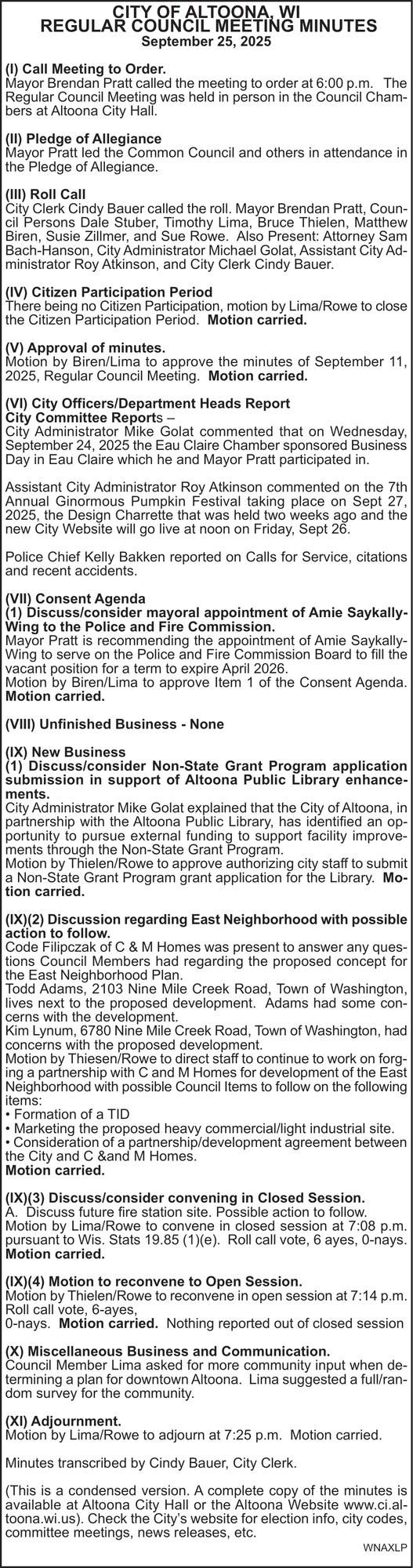 Oct 14, 2025. The City of Altoona Notice Ads from Leader-Telegram
