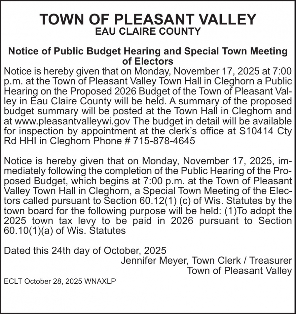 Oct 28, 2025. Town of Pleasant Valley Notice Ads from Leader-Telegram
