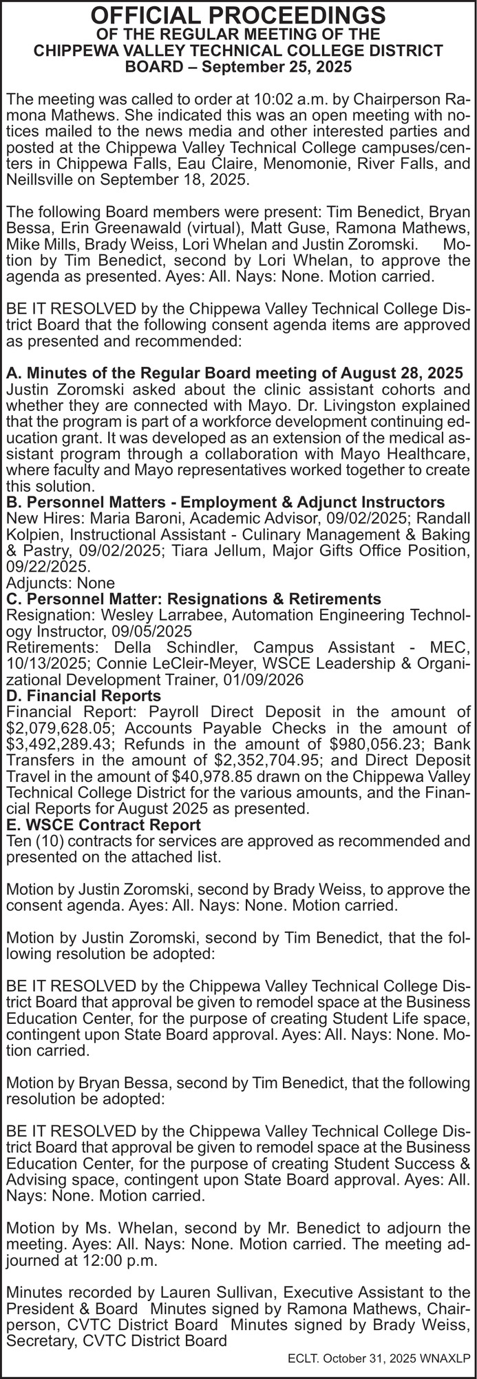 Oct 31, 2025. Chippewa Valley Technical College Notice Ads from Leader-Telegram