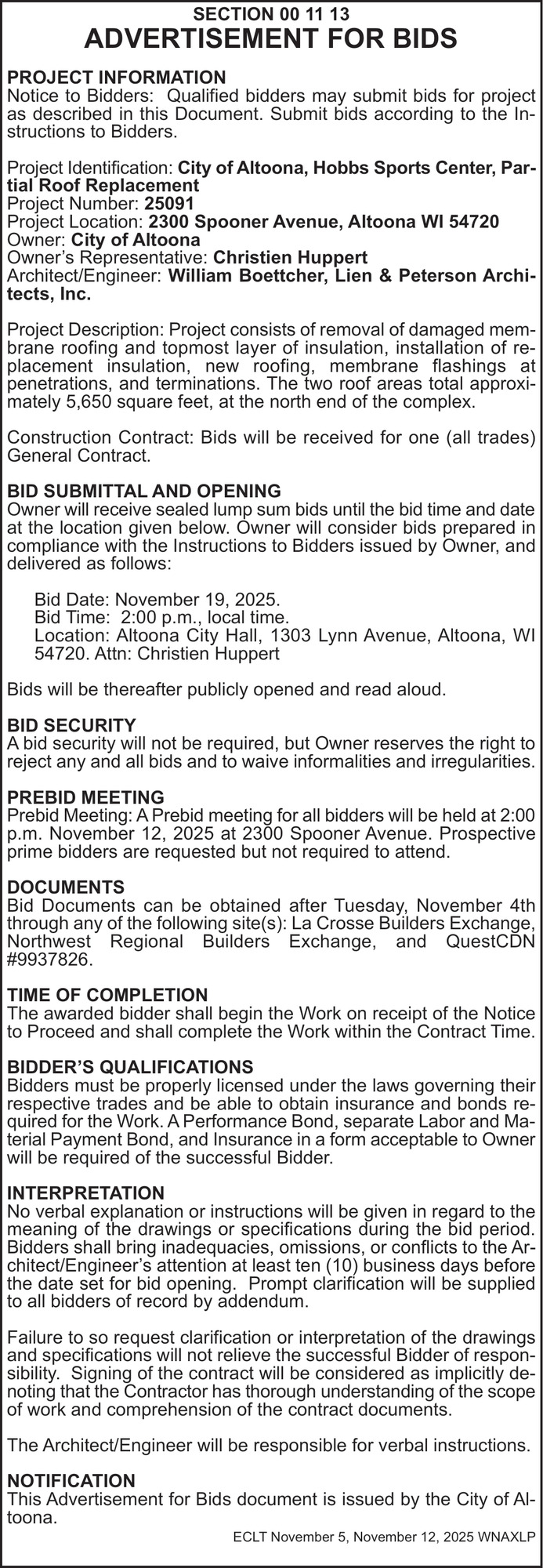 Nov 05, 2025. The City of Altoona Notice Ads from Leader-Telegram