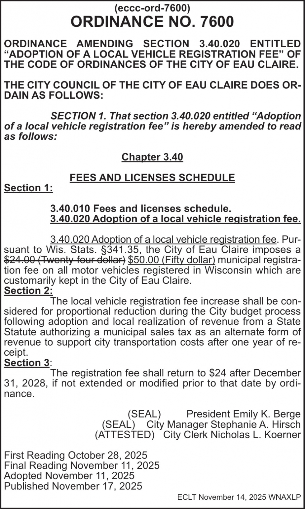 Nov 17, 2025. City of Eau Claire Notice Ads from Leader-Telegram
