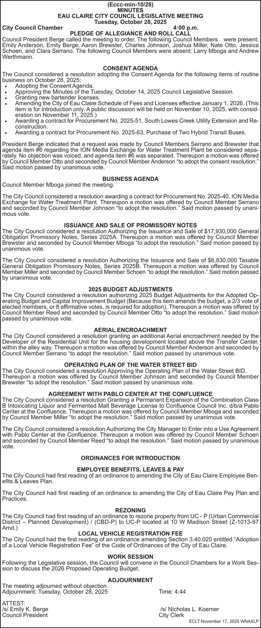 Nov 17, 2025. City of Eau Claire Notice Ads from Leader-Telegram