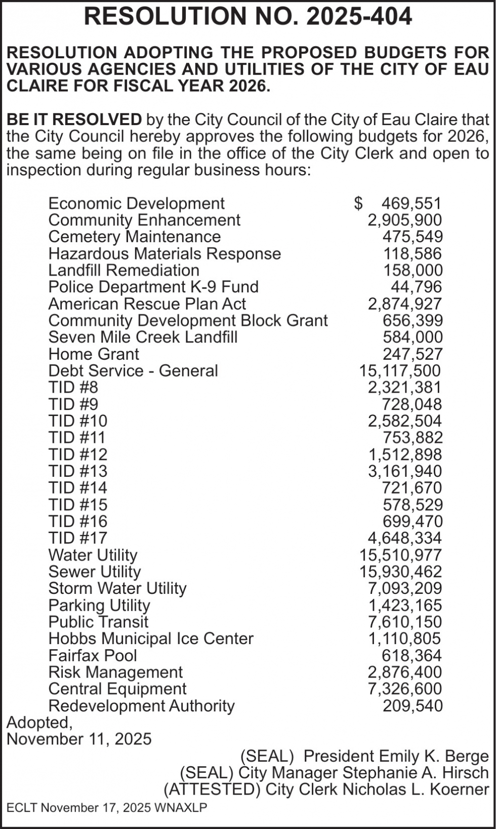Nov 17, 2025. City of Eau Claire Notice Ads from Leader-Telegram