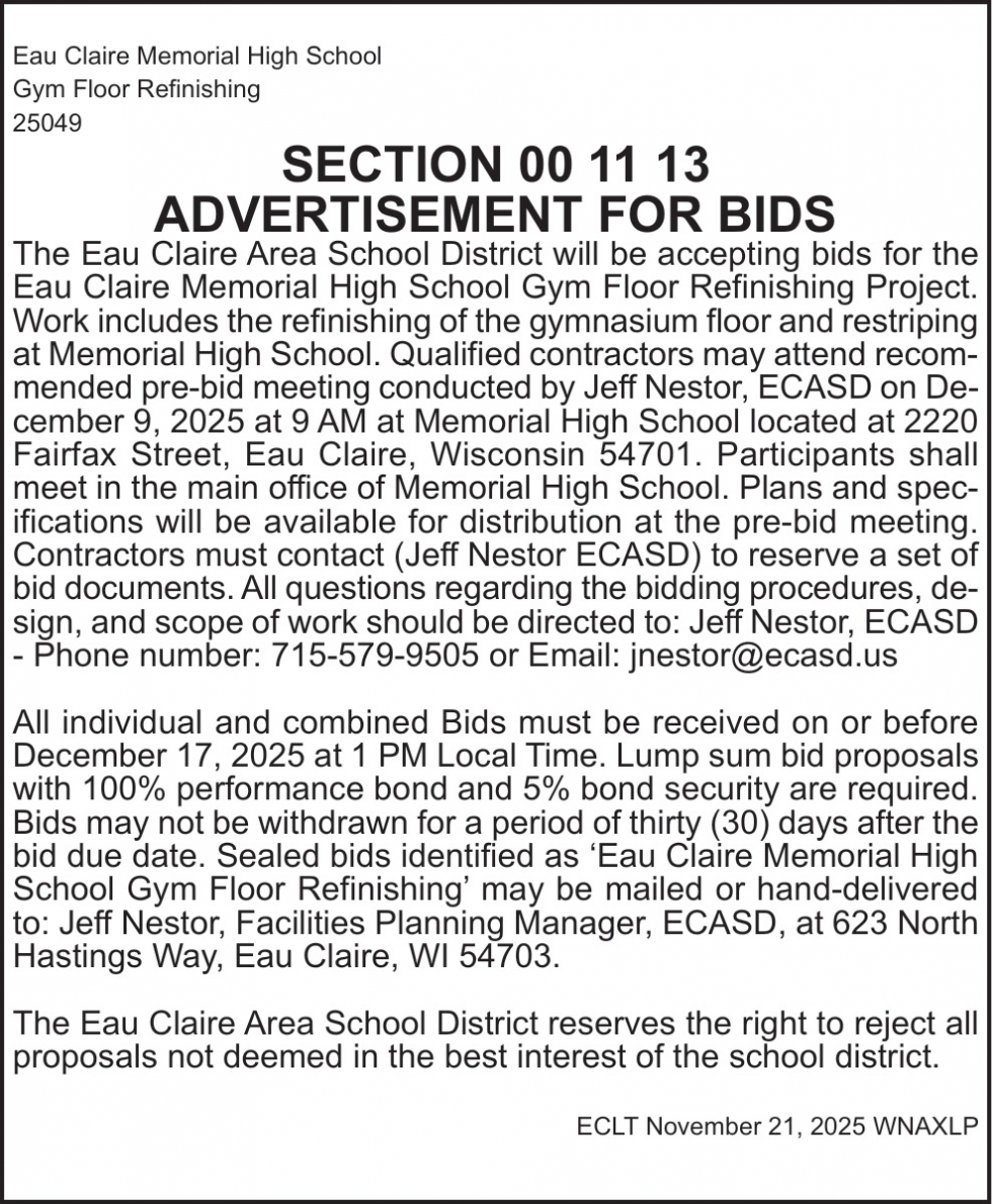 Nov 21, 2025. Eau Claire Area School District Notice Ads from Leader-Telegram