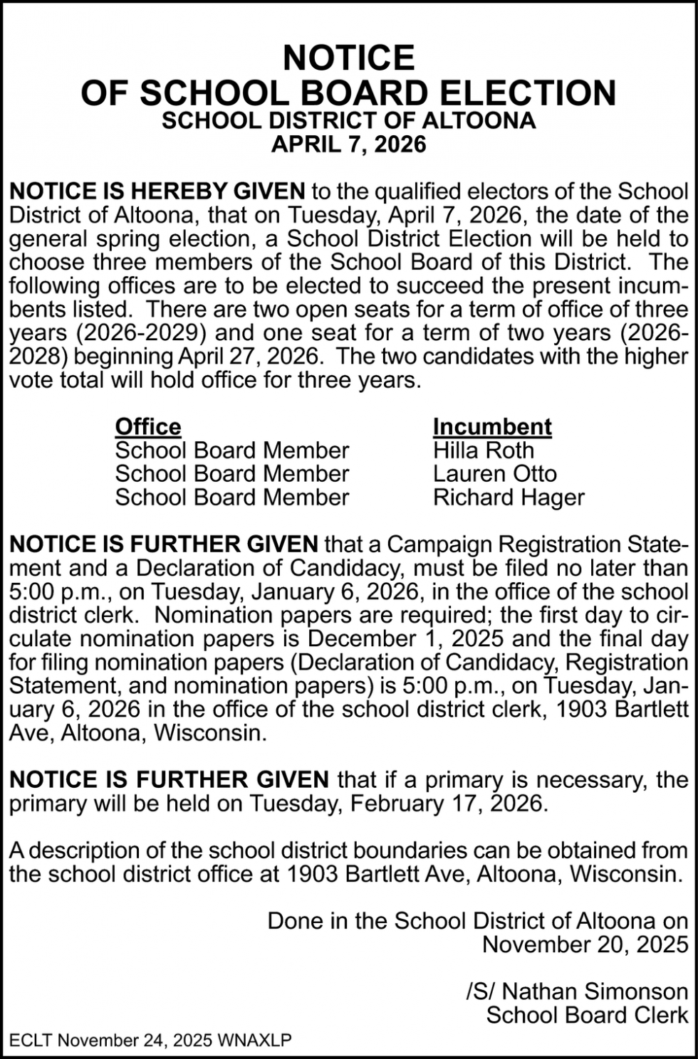 Nov 24, 2025. School District of Altoona Notice Ads from Leader-Telegram