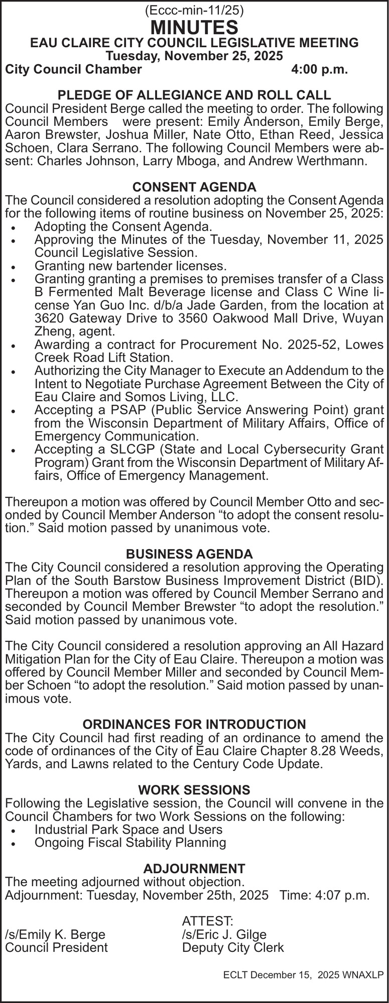 Dec 15, 2025. City of Eau Claire Notice Ads from Leader-Telegram