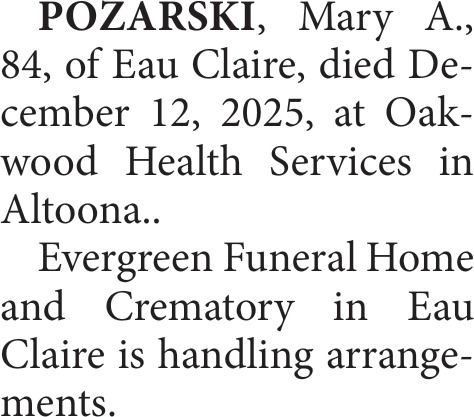 Dec 16, 2025. Evergreen Funeral Home and Crematoty Funeral and Cremation Services Ads from Leader-Telegram