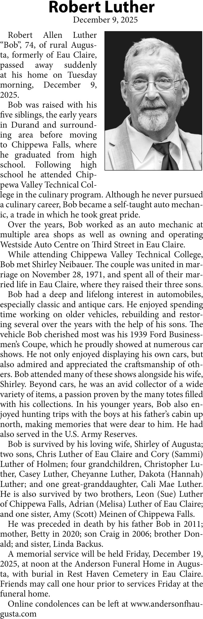 Dec 16, 2025. Anderson Funeral Home - Augusta Funeral and Cremation Services Ads from Leader-Telegram