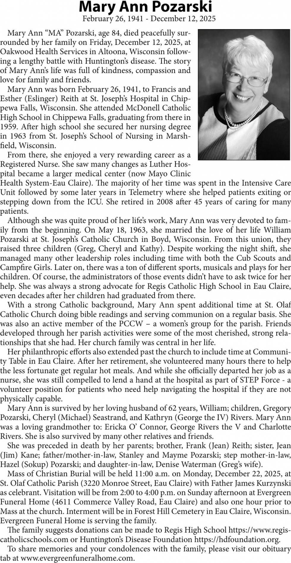 Dec 18, 2025. Evergreen Funeral Home and Crematoty Funeral and Cremation Services Ads from Leader-Telegram