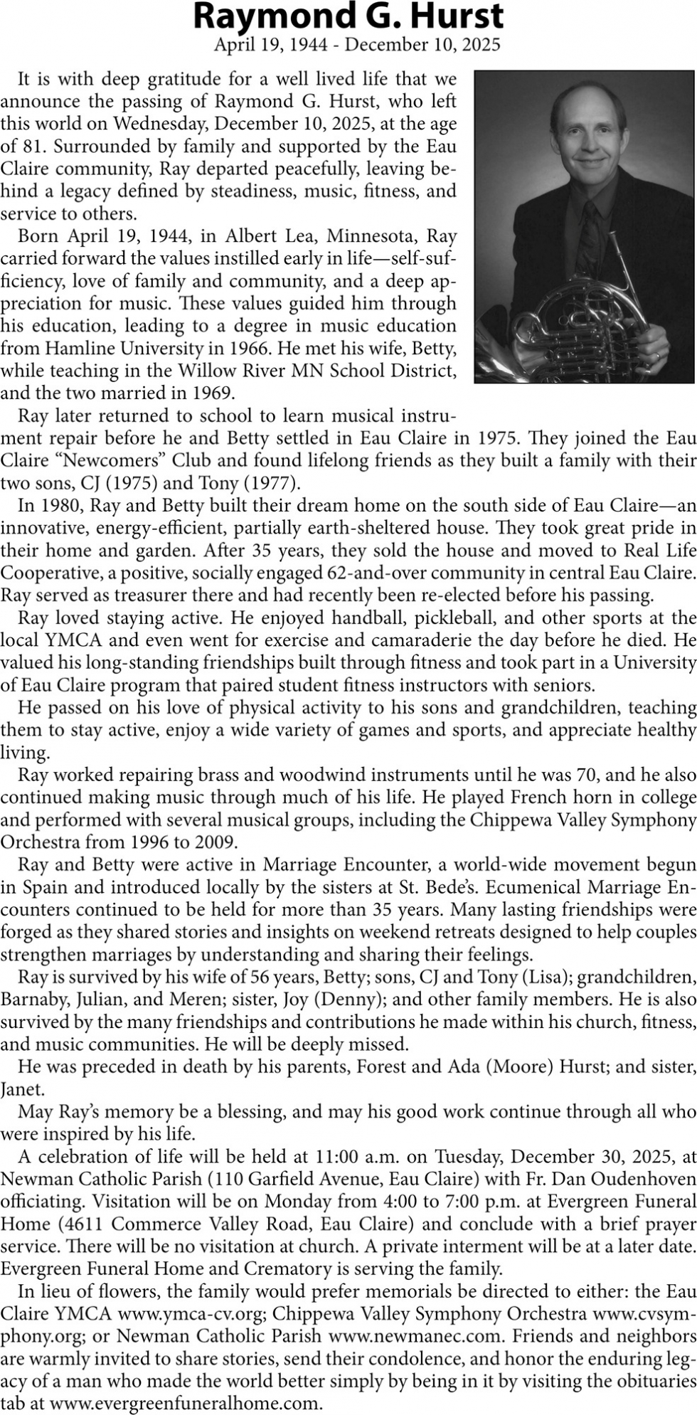 Dec 19, 2025. Evergreen Funeral Home and Crematoty Funeral and Cremation Services Ads from Leader-Telegram