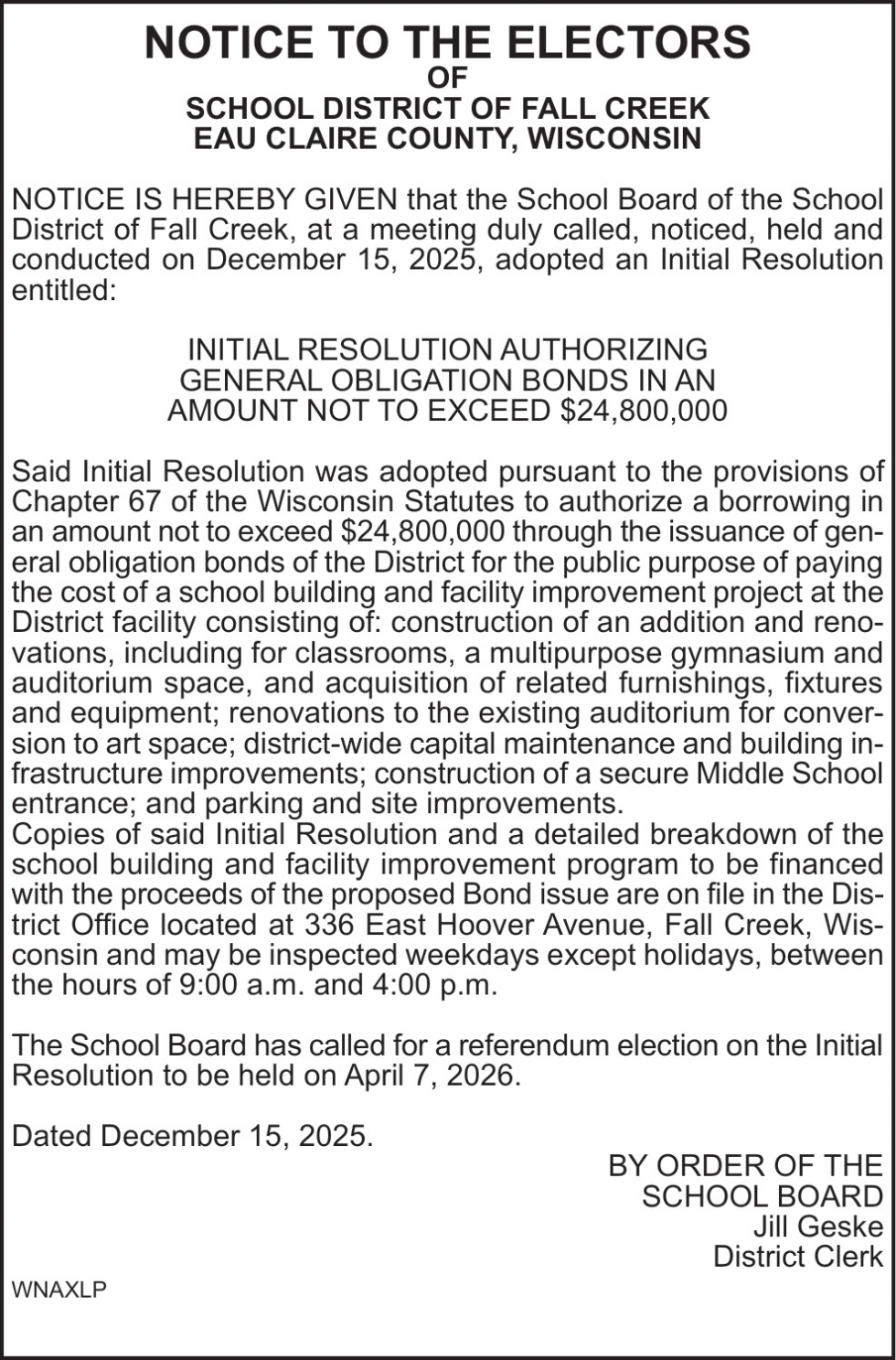 Dec 19, 2025. Fall Creek School District Notice Ads from Leader-Telegram