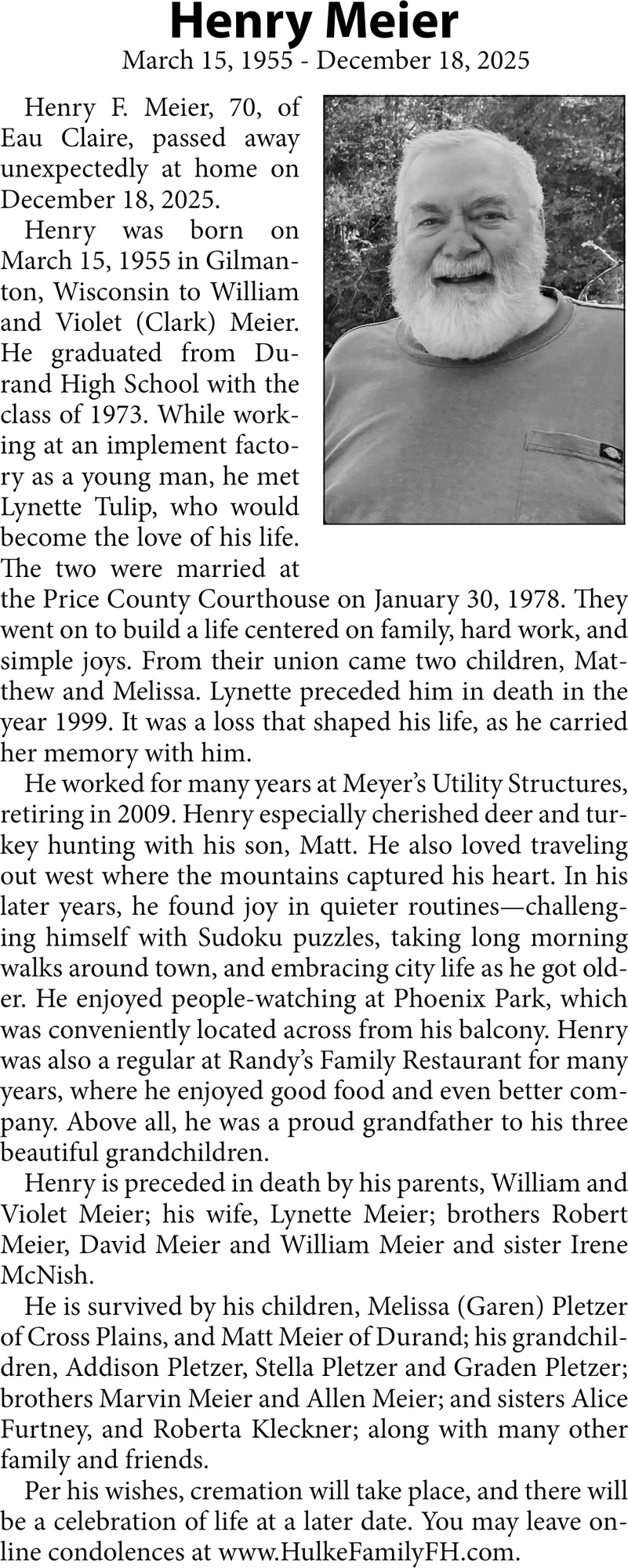 Dec 23, 2025. Hulke Family Obituaries Ads from Leader-Telegram