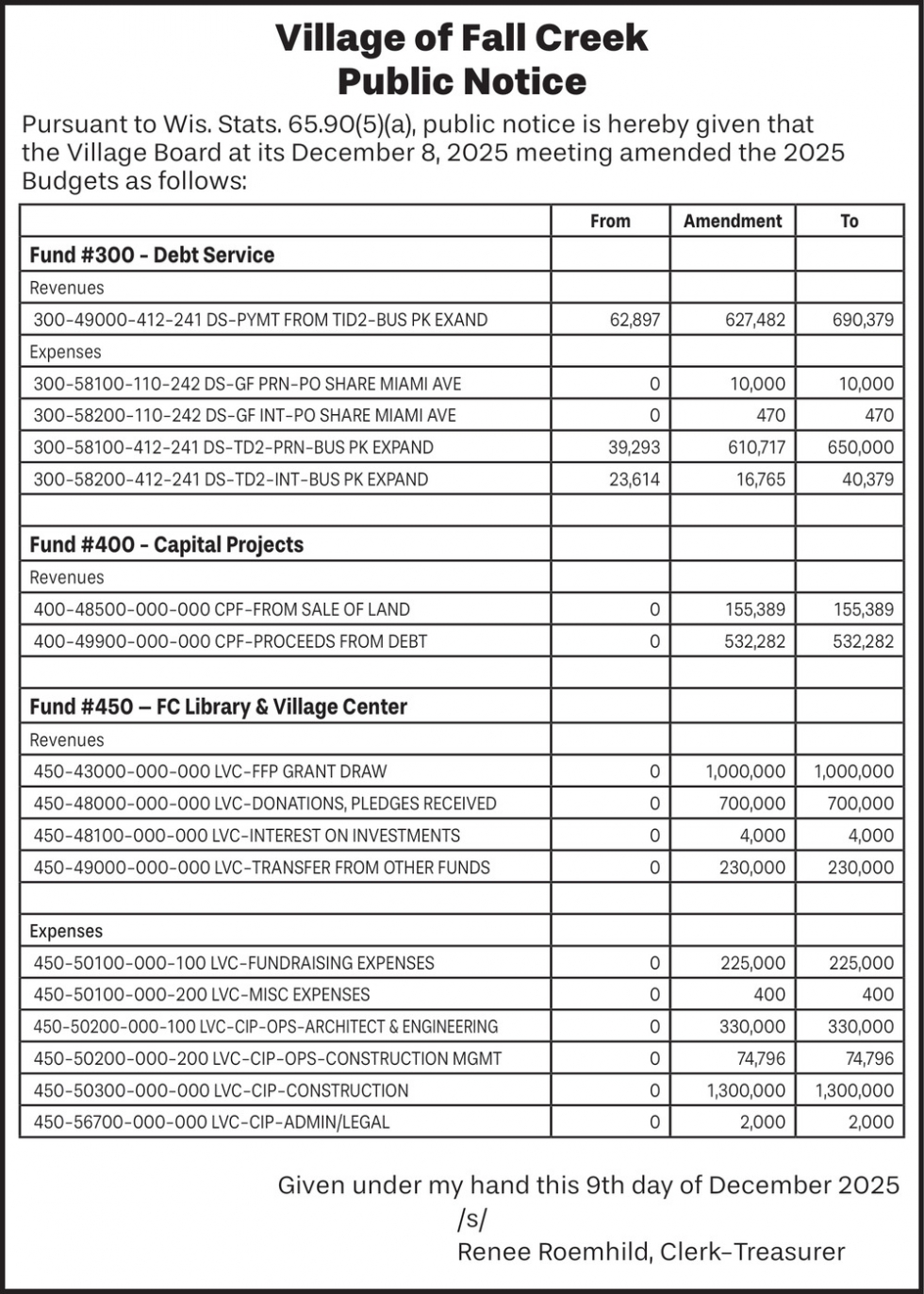Dec 29, 2025. Village of Fall Creek Notice Ads from Leader-Telegram