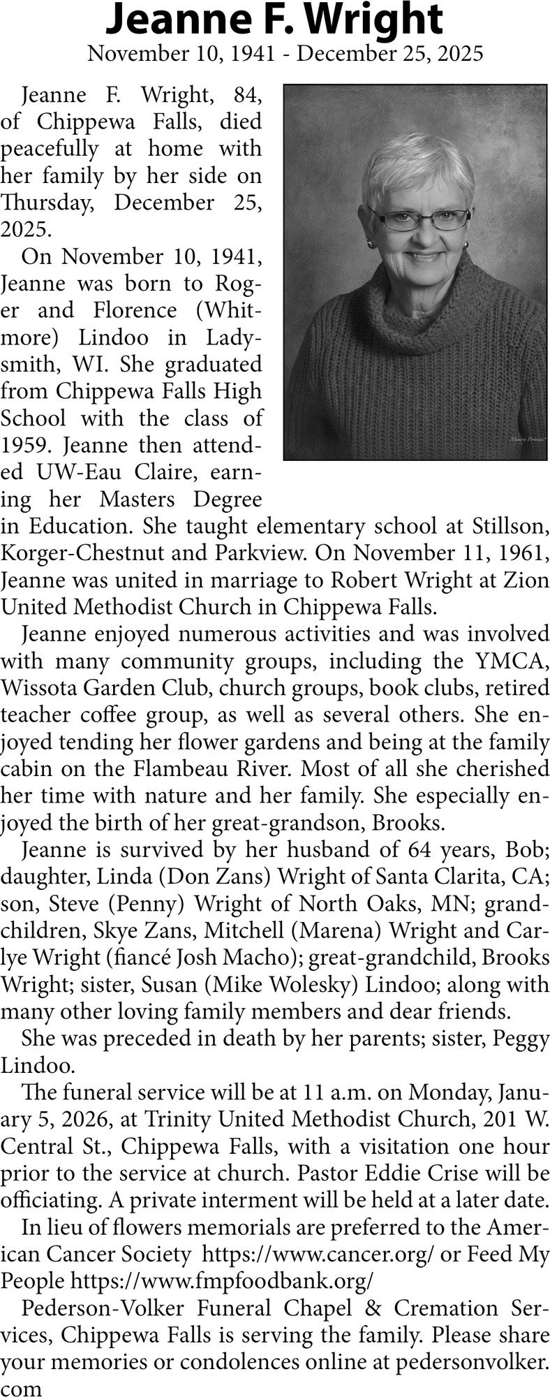 Obituary in Eau Claire, Wisconsin