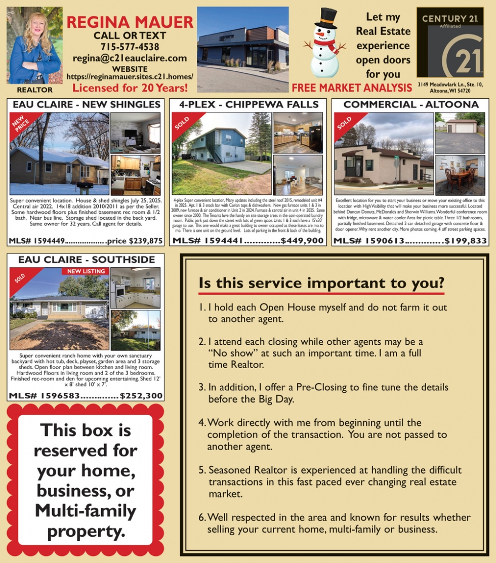 Jan 07, 2026. Regina Mauer - Century 21 Affiliated Real Estate Ads from Leader-Telegram