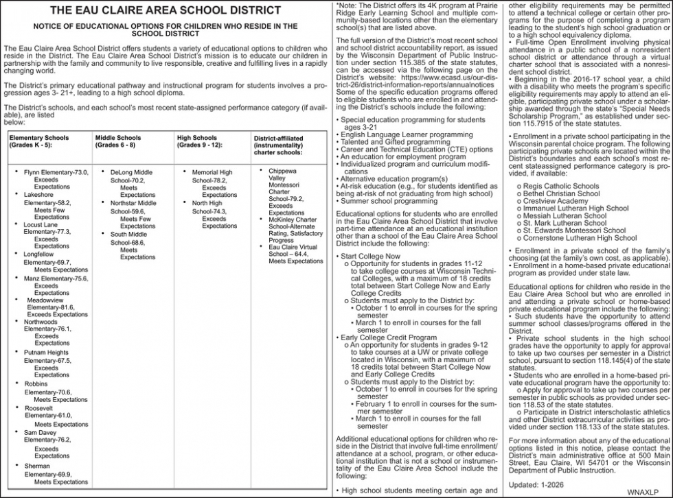 Jan 22, 2026. Eau Claire Area School District Notice Ads from Leader-Telegram