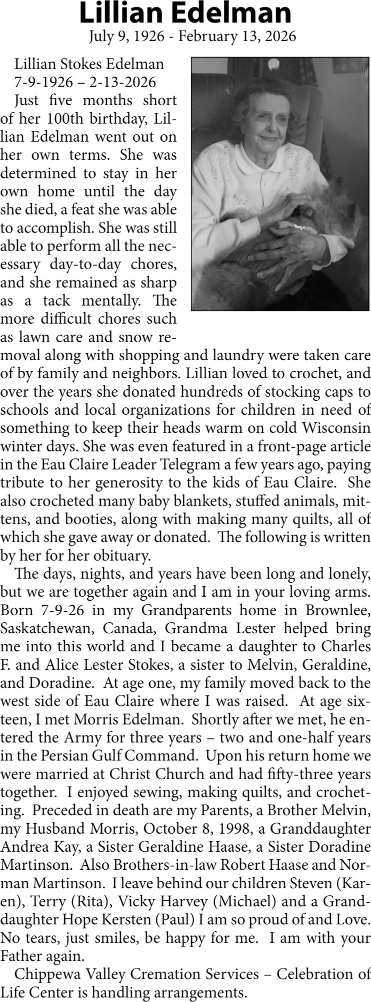 Feb 24, 2026. Obituaries Obituaries Ads from Leader-Telegram