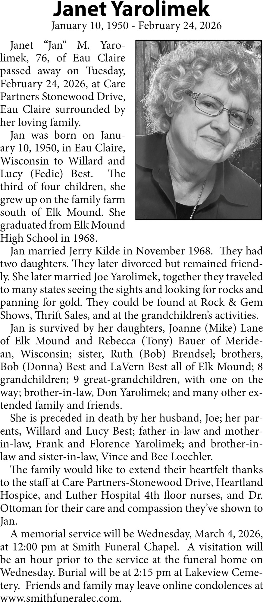 Obituary in Eau Claire, Wisconsin