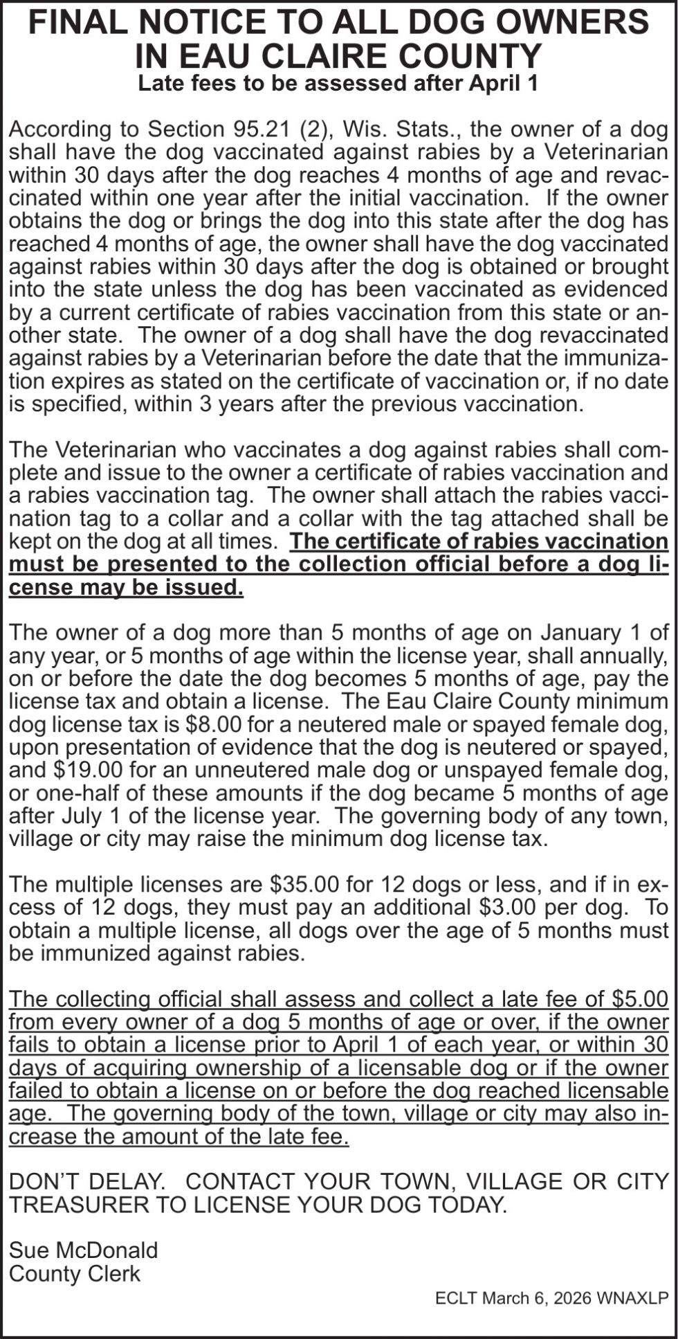 Mar 06, 2026. Eau Claire County Clerk Government Ads from Leader-Telegram