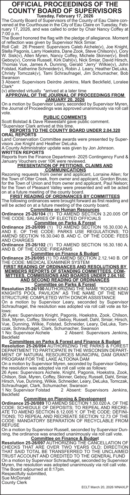 Mar 20, 2026. Eau Claire County Clerk Government Ads from Leader-Telegram