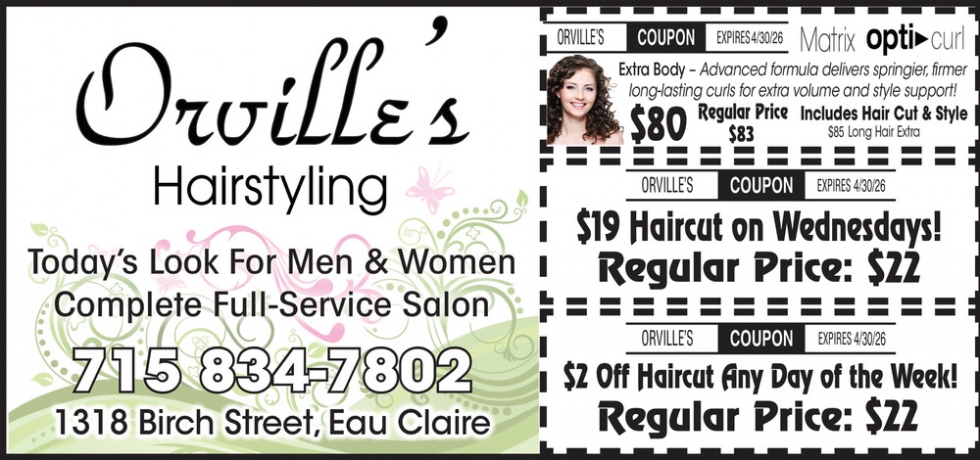 Ads for Orville's Hairstyling Salon in Eau Claire, WI