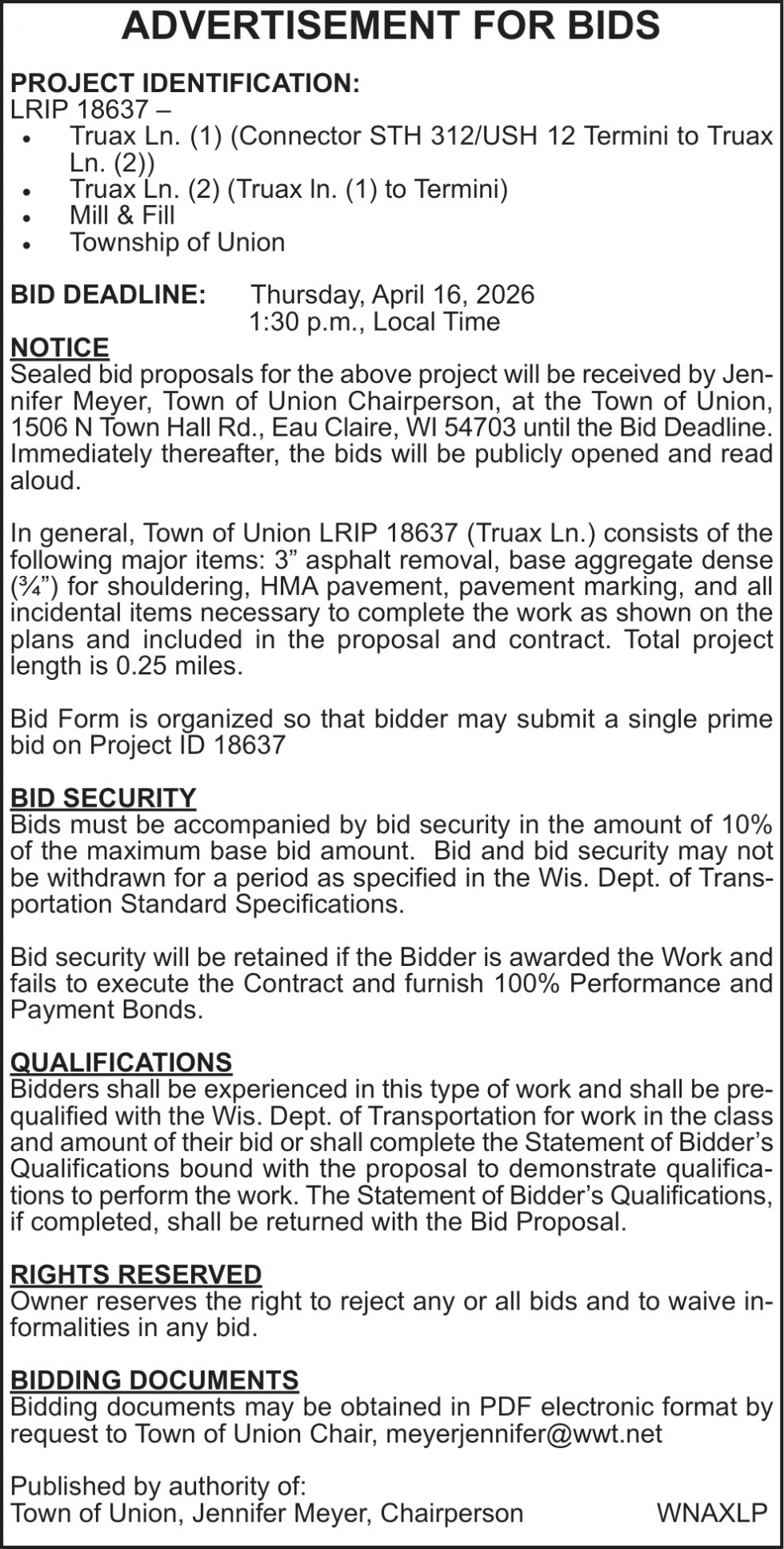 Apr 01, 2026. Town of Union Notice Ads from Leader-Telegram