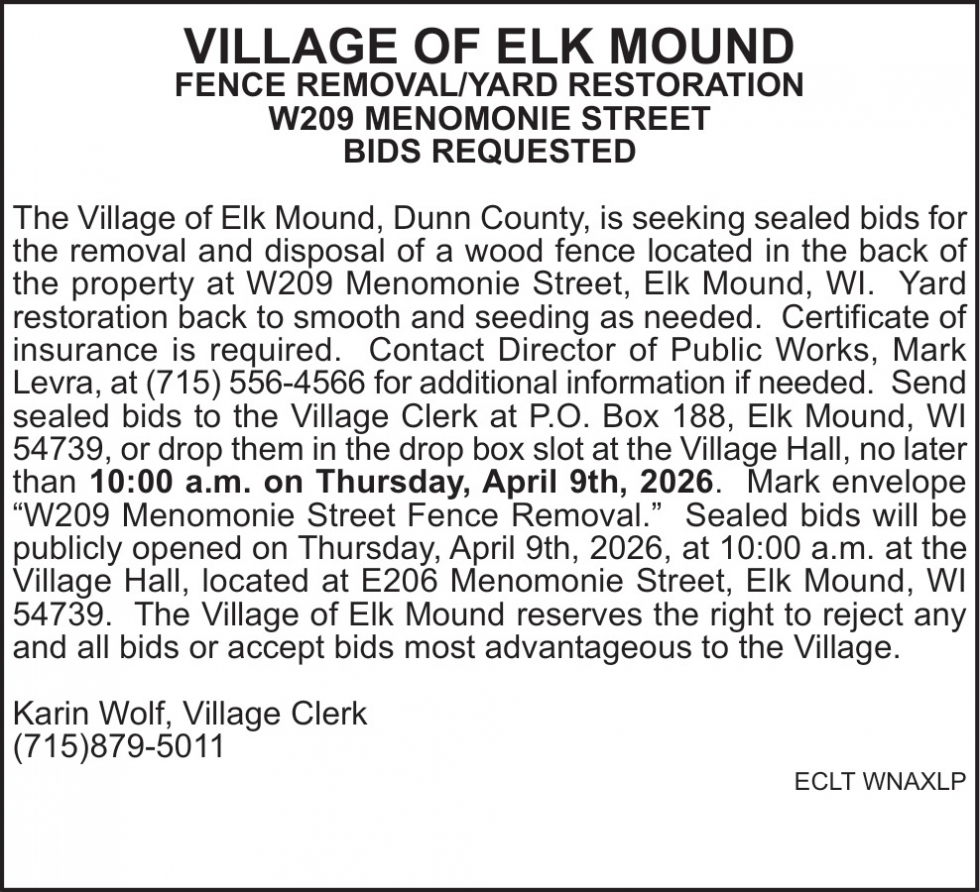 Apr 02, 2026. Village of Elk Mound Notice Ads from Leader-Telegram