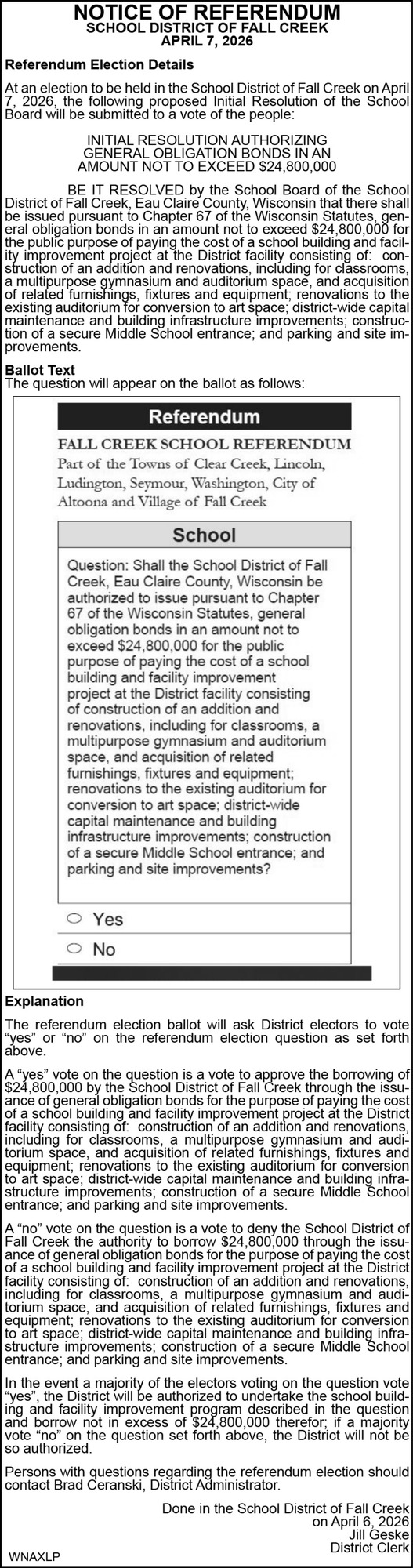 Apr 06, 2026. Fall Creek School District Notice Ads from Leader-Telegram