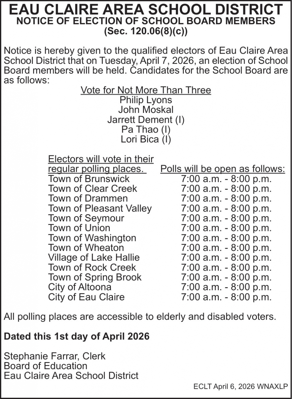 Apr 06, 2026. Eau Claire Area School District Notice Ads from Leader-Telegram