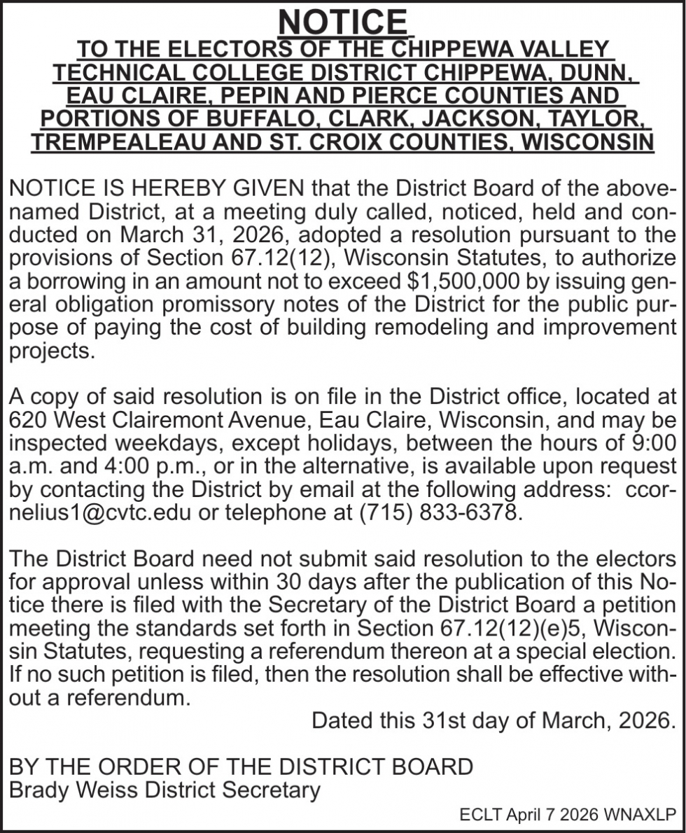 Apr 07, 2026. Chippewa Valley Technical College Notice Ads from Leader-Telegram