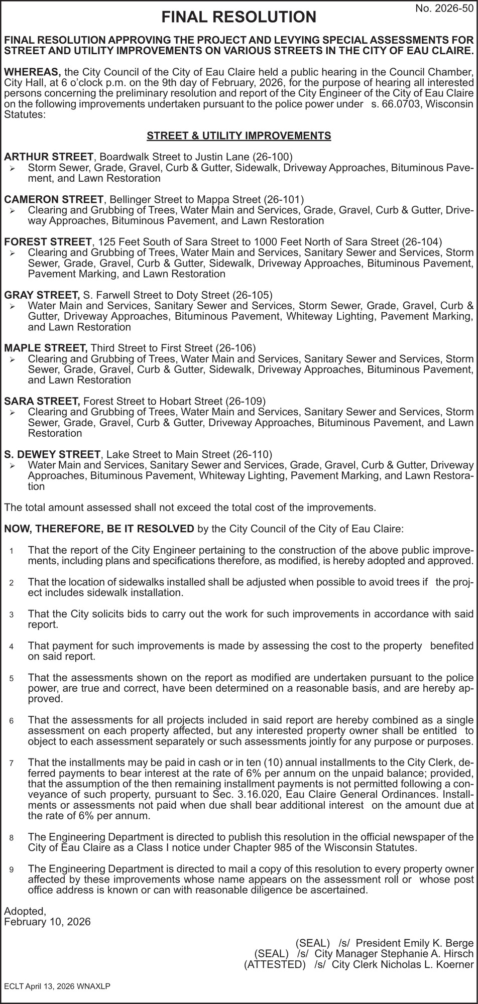 Apr 13, 2026. City of Eau Claire Notice Ads from Leader-Telegram