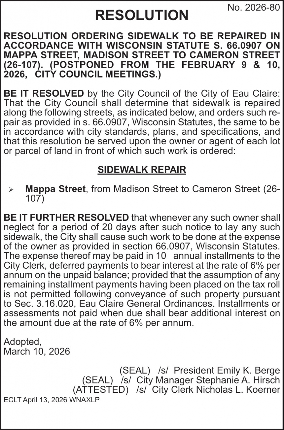 Apr 13, 2026. Eau Claire City Council Government Ads from Leader-Telegram