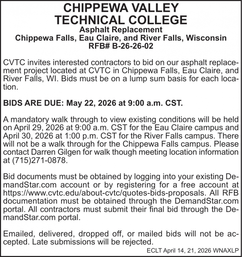 Apr 14, 2026. Chippewa Valley Technical College Notice Ads from Leader-Telegram