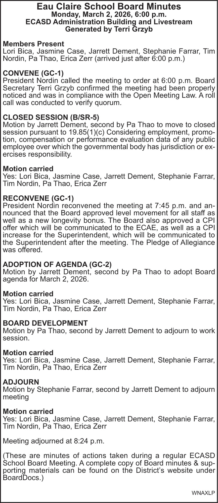Apr 15, 2026. Eau Claire School Board Notice Ads from Leader-Telegram