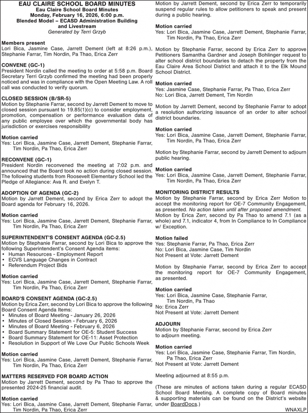Apr 15, 2026. Eau Claire School Board Notice Ads from Leader-Telegram