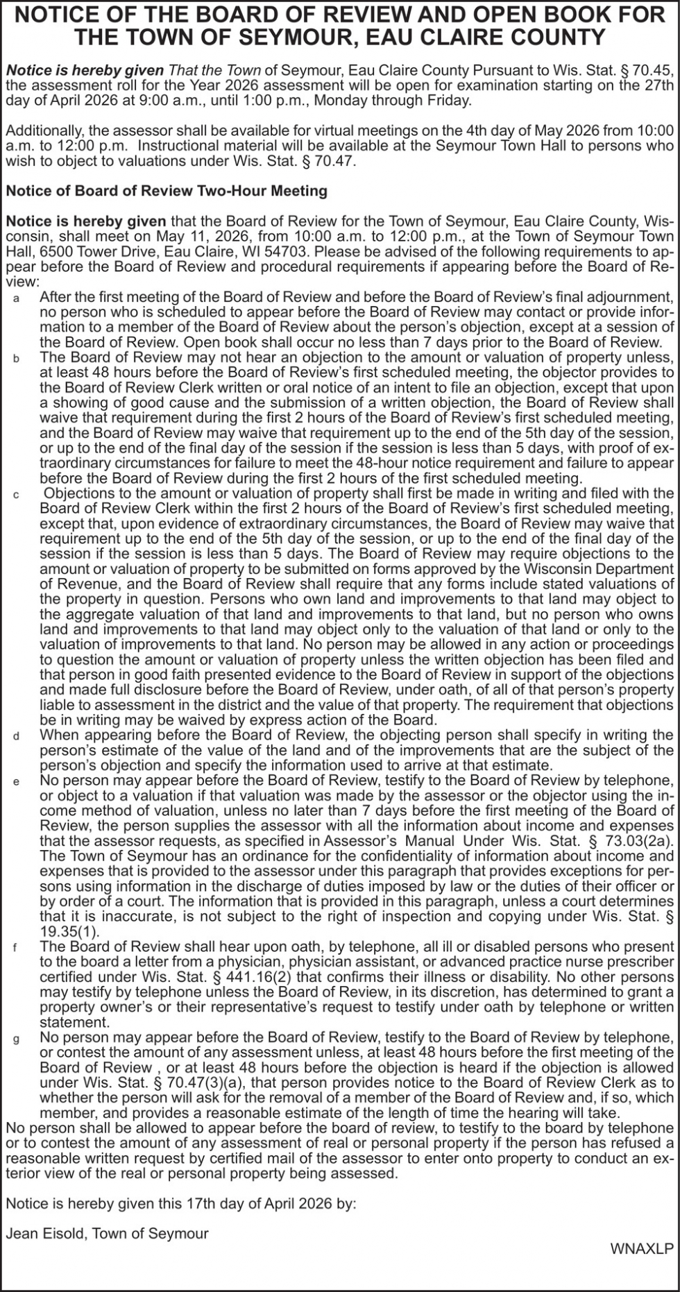 Apr 20, 2026. Town of Seymour Notice Ads from Leader-Telegram