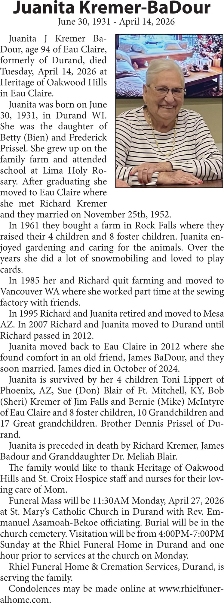 Obituary in Eau Claire, Wisconsin