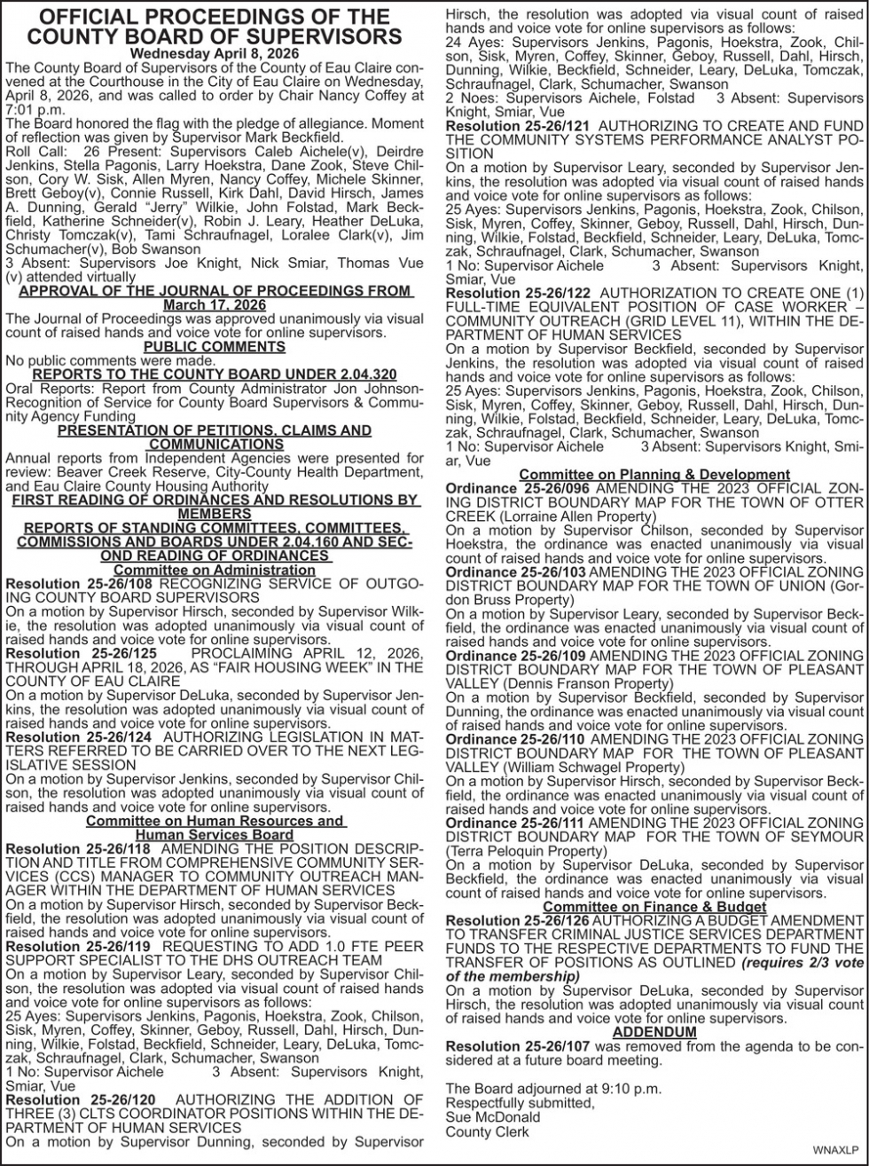 Apr 24, 2026. Eau Claire County Government Ads from Leader-Telegram