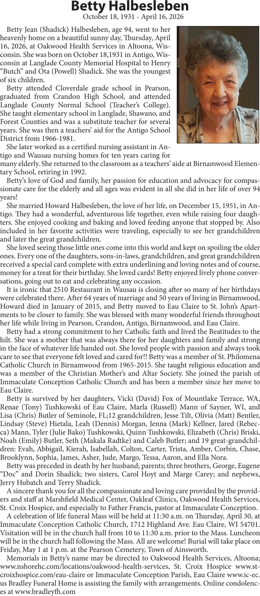 Obituary in Eau Claire, Wisconsin